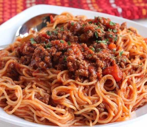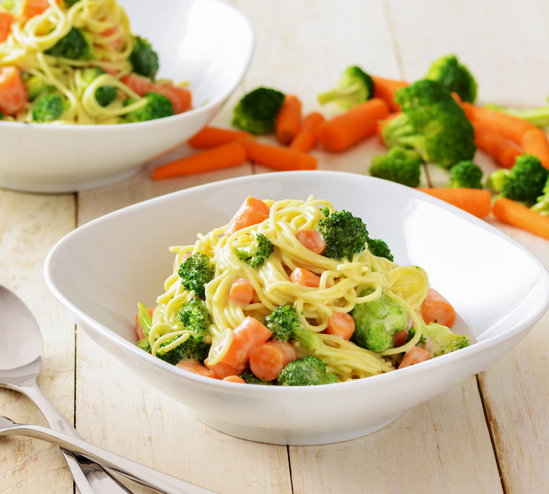 Spaghetti mixed with carrot, broccoli, corn, and cucumber