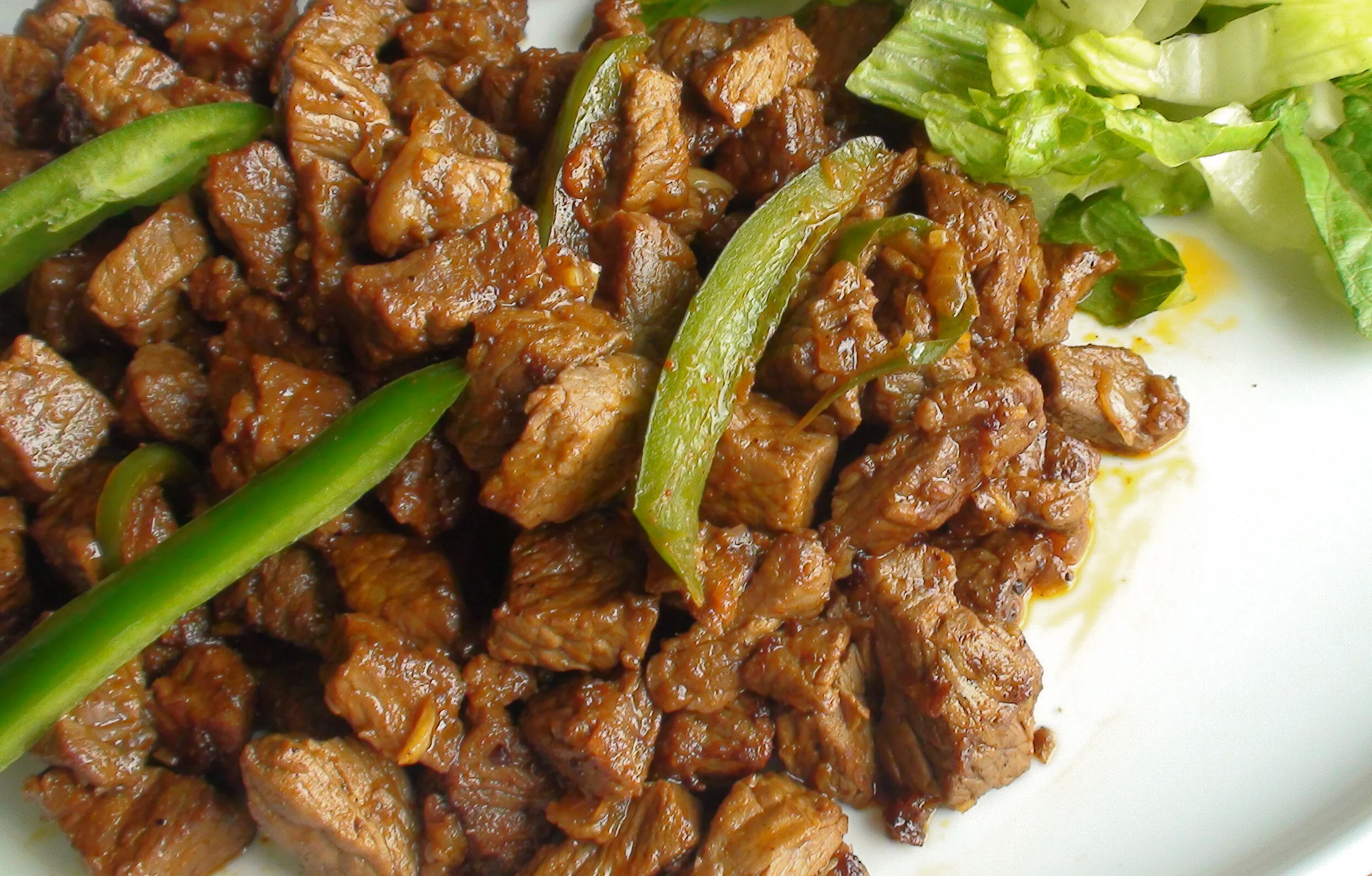Pan-fried beef with onions, tomatoes, and jalapeños