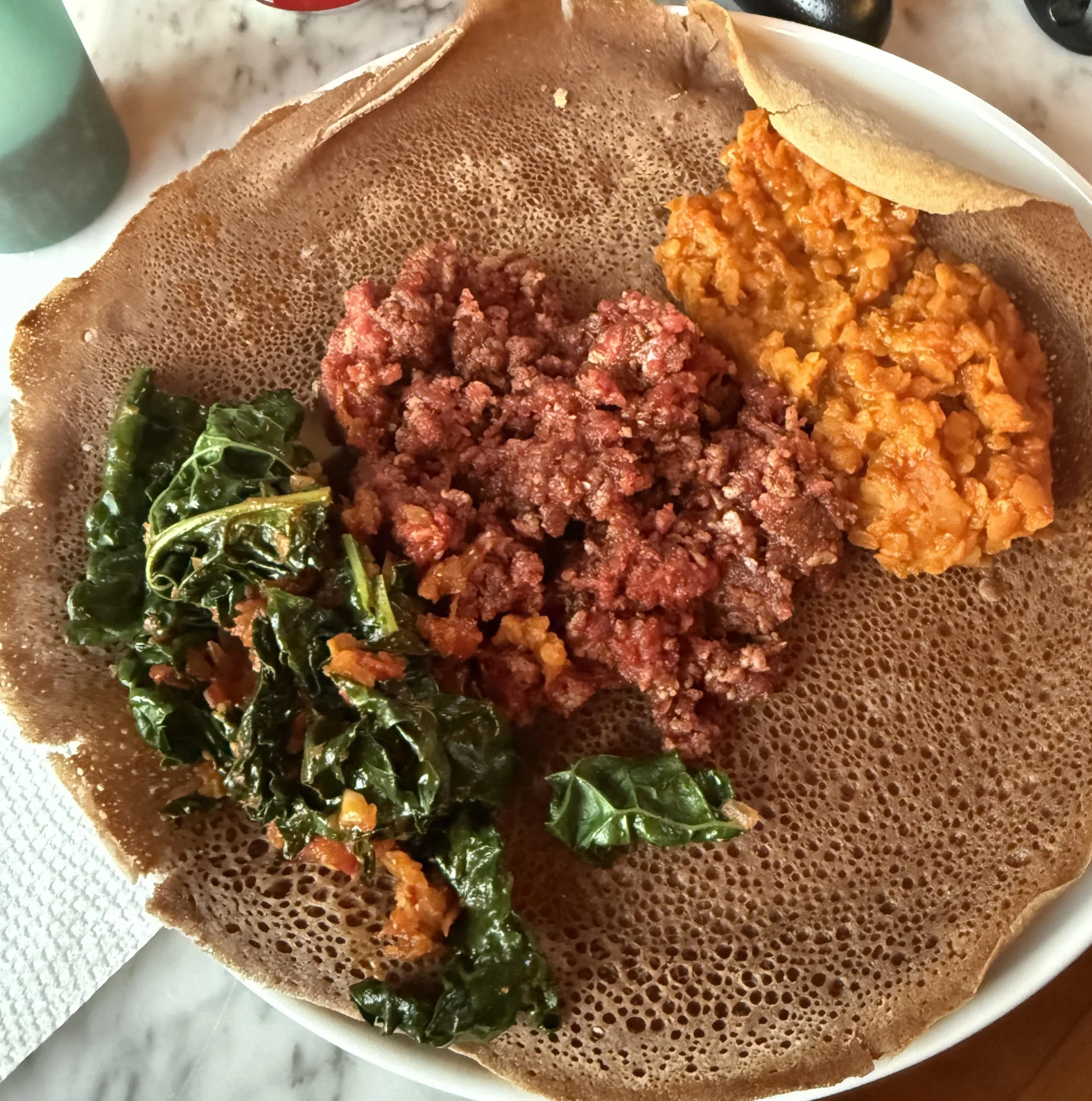 Beef sauce with tomatoes, garnished with gomen, kitfo, kinche, and ayib